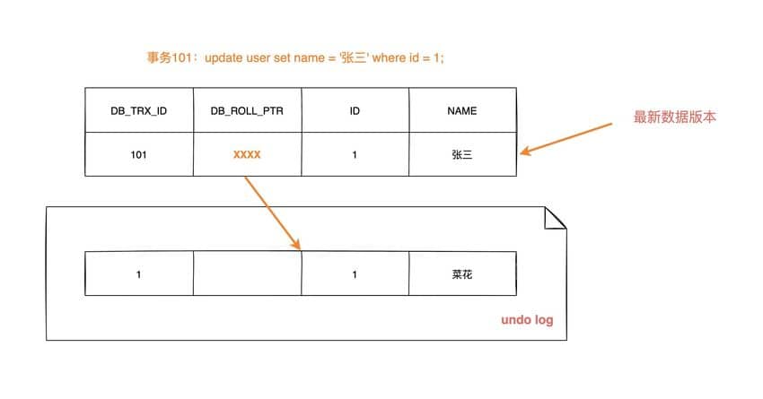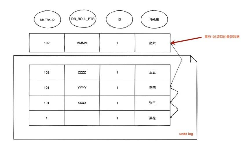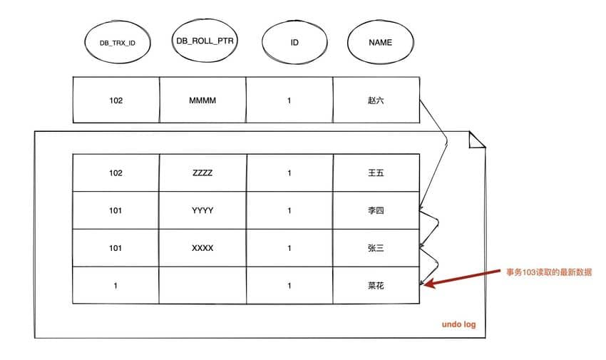 DB_ROLL_PTR找到undo log中的上一版本记录,上一条记录的DB_TRX_ID还是 101,不可见继续找上一条